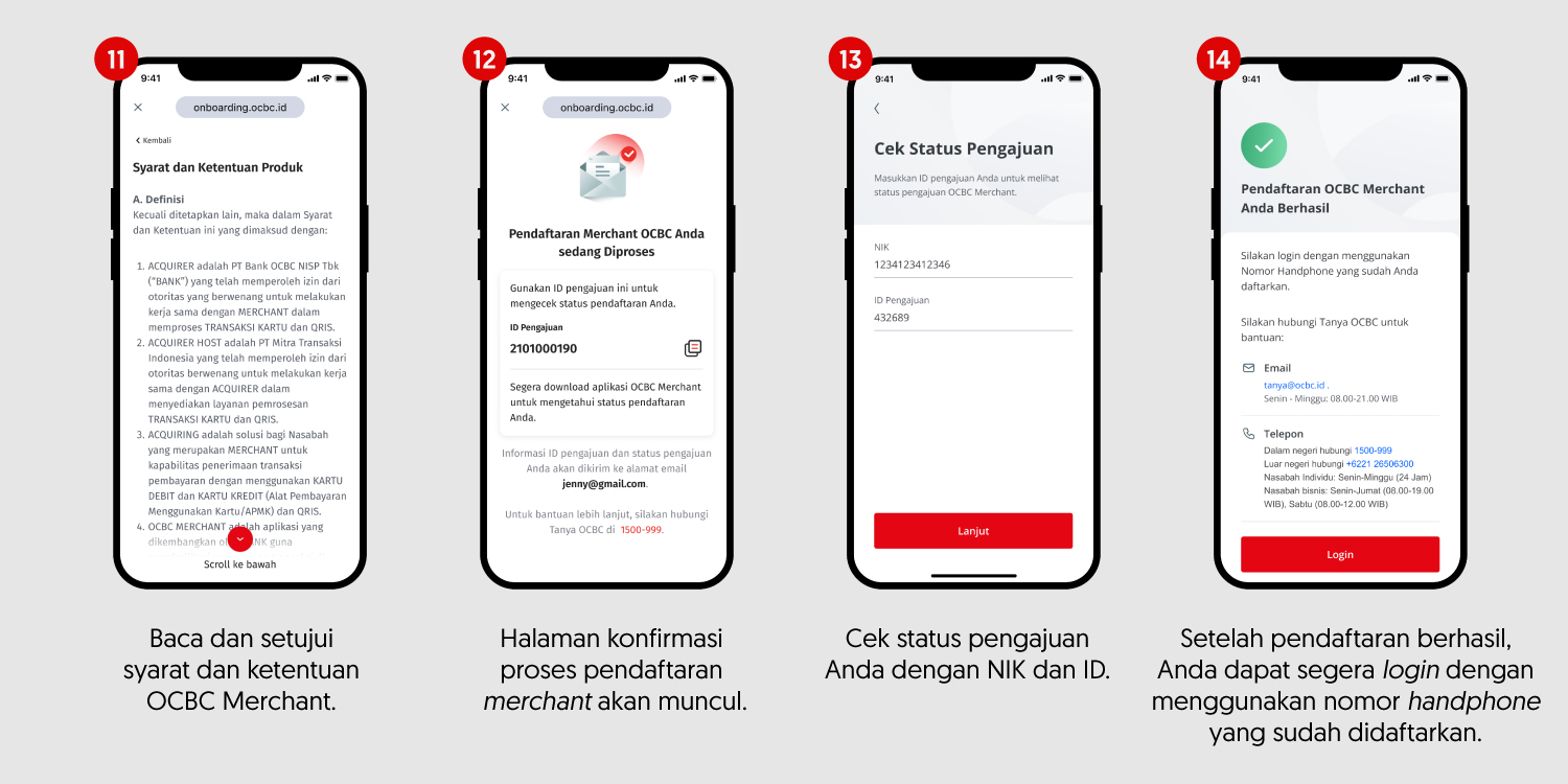 Saat Anda selesai melakukan pendaftaran, OCBC Merchant akan memberikan ID Pengajuan melalui aplikasi dan email. Anda dapat melakukan pengecekan status pengajuan pada aplikasi OCBC Merchant dengan memasukkan ID Pengajuan dan NIK yang digunakan pada saat pendaftaran.