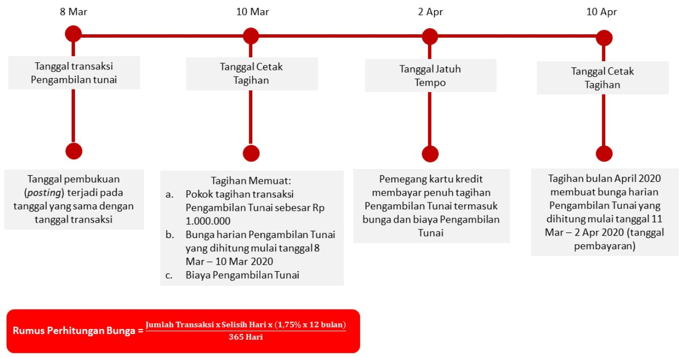 Bunga untuk Pengambilan Tunai (Cash Advance) dibebankan dan dihitung sejak Tanggal Penarikan (Cash Advance) sampai dengan tanggal dilakukannya pembayaran penuh dari transaksi Pengambilan Tunai tersebut. Suku bunga yang berlaku untuk transaksi Pengambilan Tunai tercantum pada Lembar Penagihan. Biaya, denda, ataupun bunga yang belum dibayarkan tidak termasuk dalam komponen perhitungan bunga. Untuk perhitungan bunga secara lengkap dapat dilihat pada ilustrasi Perhitungan Bunga Kartu Kredit.